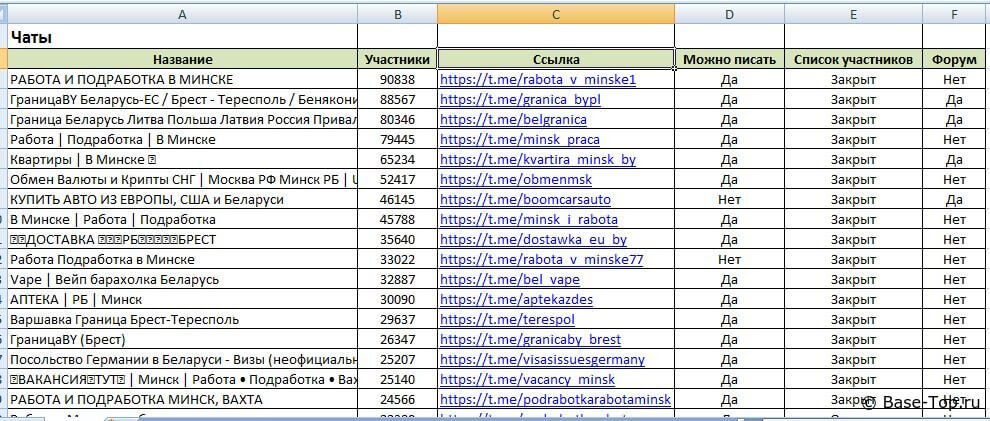 В базе попадаются чаты / каналы таких городов как: Минск, Гомель, Могилёв, Витебск, Гродно, Брест, Бобруйск, Мозырь, Солигорск, Новополоцк и другие.