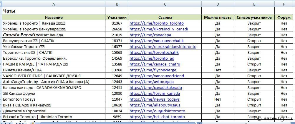В базе попадаются чаты / каналы таких городов как: Ванкувер, Торонто, Монреаль, Квебек, Оттава, Калгари, Виннипег, Эдмонтон, Гамильтон, Фредериктон, Сент-катаринс, Китченер, Сент-джонс, Виндзор, Кингстон, Шербрук, Ватерлоо и другие.